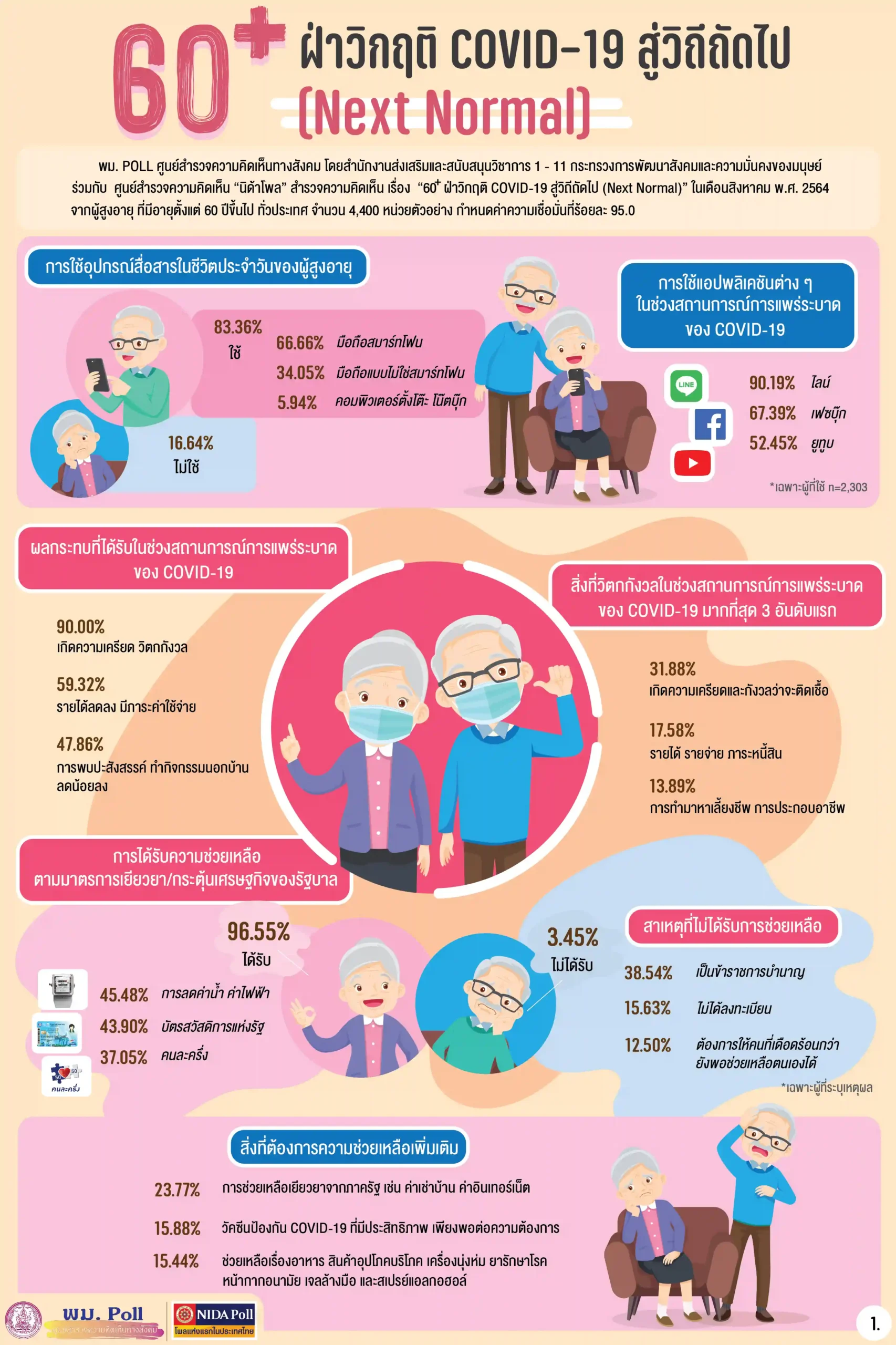 พม. POLL ศูนย์สำรวจความคิดเห็นทางสังคม สำนักงานส่งเสริมและสนับสนุนวิชาการ 1-11 กระทรวงการพัฒนาสังคมและความมั่นคงของมนุษย์ ร่วมกับ ศูนย์สำรวจความคิดเห็น “นิด้าโพล” สถาบันบัณฑิตพัฒนบริหารศาสตร์ (นิด้า) เปิดเผยผลสำรวจ เรื่อง “60+ ฝ่าวิกฤติ COVID-19 สู่วิถีถัดไป (Next Normal)” ทำการสำรวจในเดือนสิงหาคม พ.ศ. 2564 จากผู้สูงอายุมีอายุตั้งแต่ 60 ปีบริบูณ์ขึ้นไป กระจายทุกภูมิภาคทั่วประเทศ ใช้ระเบียบวิธีวิจัยเชิงสำรวจ (Survey Research) โดยใช้วิธีการสุ่มตัวอย่าง แบบหลายขั้นตอน (Multi-Stage Sampling) รวมขนาดตัวอย่างทั้งสิ้น จำนวน 4,400 หน่วยตัวอย่าง เก็บรวบรวมข้อมูลด้วยวิธีลงพื้นที่ภาคสนาม และการตอบแบบสอบถามออนไลน์ กำหนดค่าควา มเชื่อมั่น ร้อยละ 95.00
