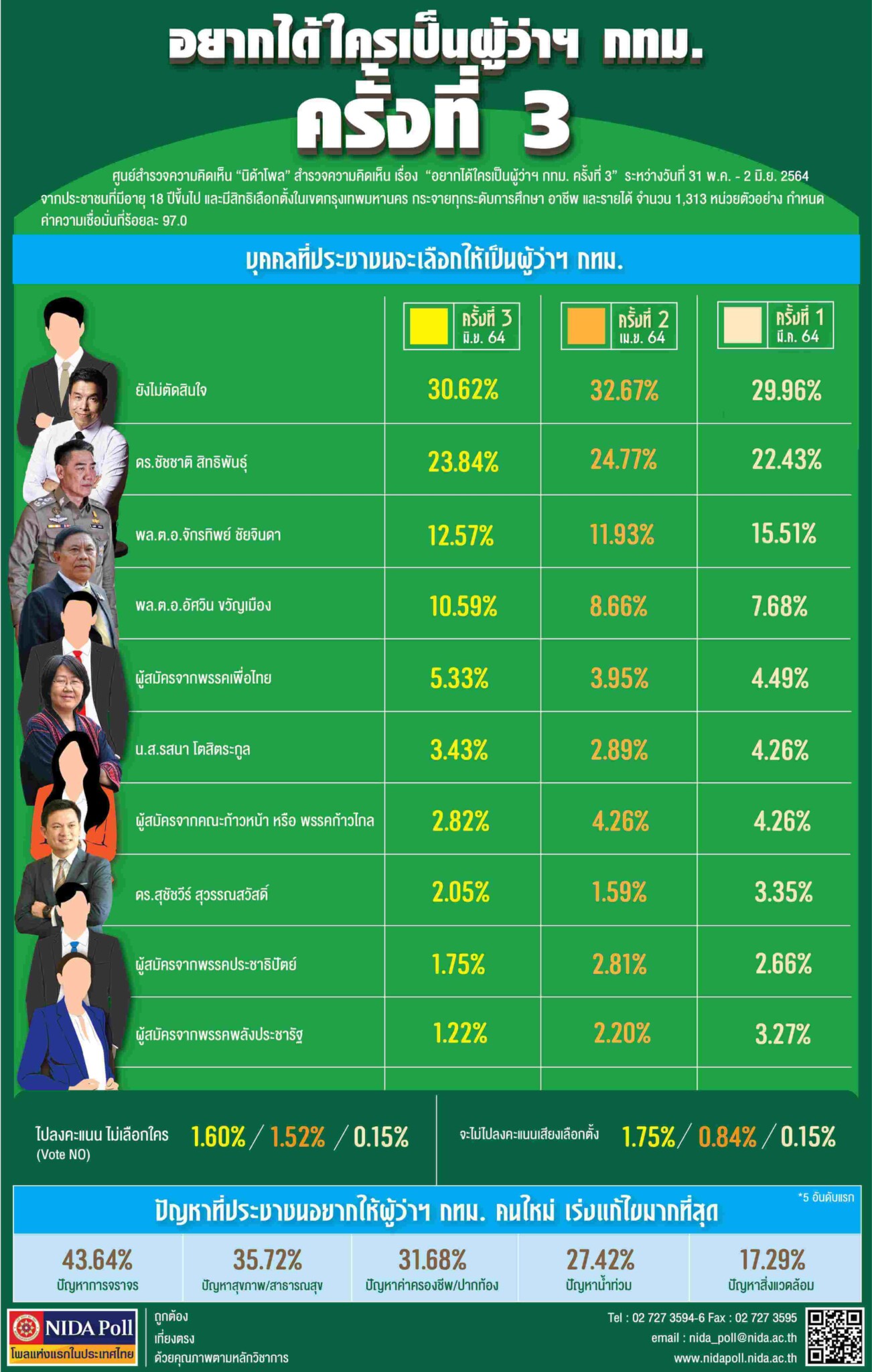 ศูนย์สำรวจความคิดเห็น “นิด้าโพล” สถาบันบัณฑิตพัฒนบริหารศาสตร์ (นิด้า) เปิดเผยผลสำรวจของประชาชน เรื่อง อยากได้ใครเป็นผู้ว่าฯ กทม. ครั้งที่ 3” ทำการสำรวจระหว่างวันที่ 31 พฤษภาคม – 2 มิถุนายน 2564 จากประชาชนที่มีอายุ 18 ปีขึ้นไป และมีสิทธิเลือกตั้งในกรุงเทพมหานคร กระจายทุกระดับการศึกษา อาชีพ และรายได้ รวมทั้งสิ้น จำนวน 1,313 หน่วยตัวอย่าง เกี่ยวกับประชาชนอยากได้ใครเป็นผู้ว่าฯ กทม. ครั้งที่ 3 การสำรวจอาศัยการสุ่มตัวอย่างโดยใช้ความน่าจะเป็นจากบัญชีรายชื่อฐานข้อมูลตัวอย่างหลัก (Master Sample) ของ “นิด้าโพล” สุ่มตัวอย่างด้วยวิธีแบบง่าย  (Simple Random Sampling) เก็บข้อมูลด้วยวิธีการสัมภาษณ์ทางโทรศัพท์ โดยกำหนดค่าความเชื่อมั่นที่ร้อยละ 97.0