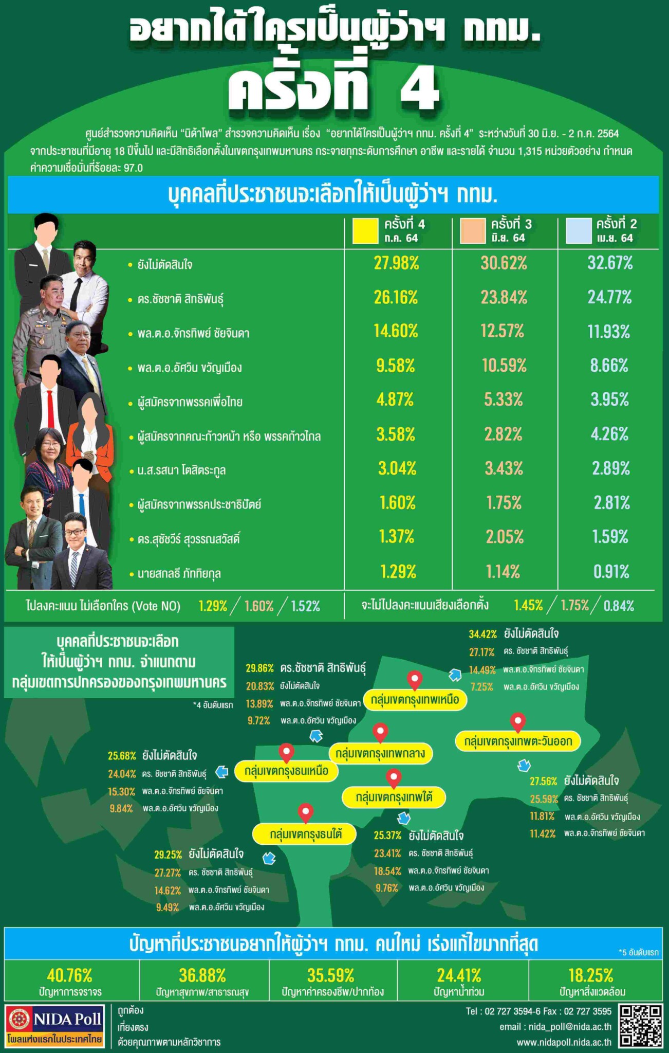 ศูนย์สำรวจความคิดเห็น “นิด้าโพล” สถาบันบัณฑิตพัฒนบริหารศาสตร์ (นิด้า) เปิดเผยผลสำรวจของประชาชน เรื่อง “อยากได้ใครเป็นผู้ว่าฯกทม. ครั้งที่ 4” ทำการสำรวจระหว่างวันที่ 30 มิถุนายน – 2 กรกฎาคม 2564 จากประชาชนที่มีอายุ 18 ปีขึ้นไป และมีสิทธิเลือกตั้งในกรุงเทพมหานคร กระจายทุกระดับการศึกษา อาชีพ และรายได้ รวมทั้งสิ้น จำนวน 1,315 หน่วยตัวอย่าง เกี่ยวกับประชาชนอยากได้ใครเป็น ผู้ว่าฯ กทม. ครั้งที่ 4 การสำรวจอาศัยการสุ่มตัวอย่างโดยใช้ความน่าจะเป็นจากบัญชีรายชื่อฐานข้อมูลตัวอย่างหลัก (Master Sample) ของ “นิด้าโพล” สุ่มตัวอย่างด้วยวิธีแบบง่าย (Simple Random Sampling) เก็บข้อมูลด้วยวิธีการสัมภาษณ์ทางโทรศัพท์ โดยกำหนดค่าความเชื่อมั่นที่ร้อยละ 97.0