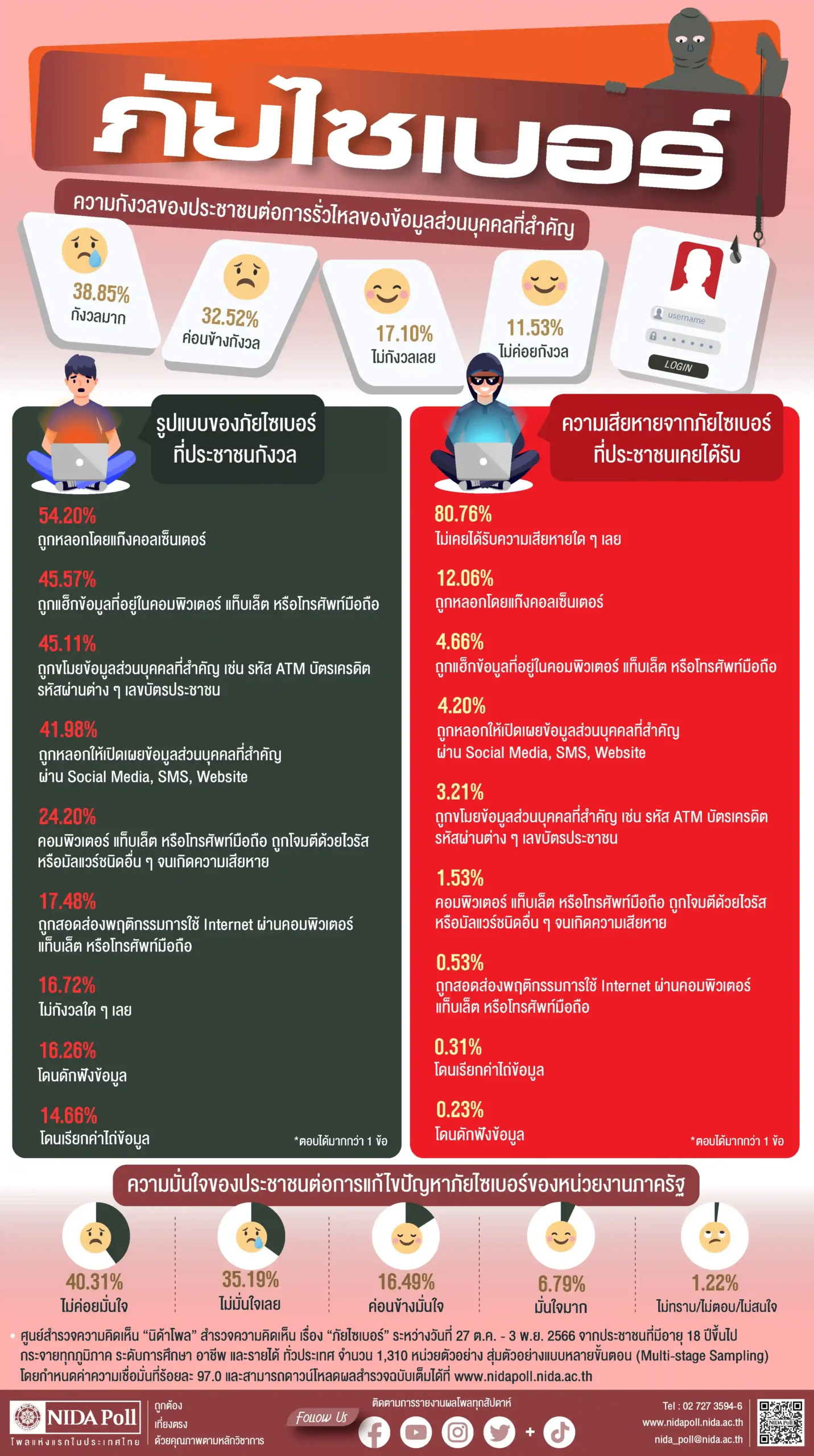 ศูนย์สำรวจความคิดเห็น นิด้าโพล สถาบันบัณฑิตพัฒนบริหารศาสตร์ (นิด้า) เปิดเผยผลสำรวจของประชาชน เรื่อง ภัยไซเบอร์ ทำการสำรวจระหว่างวันที่ 27 ตุลาคม ถึง 3 พฤศจิกายน 2566 จากประชาชนที่มีอายุ 18 ปีขึ้นไป กระจายทุกภูมิภาค ระดับการศึกษา อาชีพ และรายได้ ทั่วประเทศ รวมทั้งสิ้น จำนวน 1,310 หน่วยตัวอย่าง เกี่ยวกับภัยไซเบอร์ การสำรวจอาศัยการสุ่มตัวอย่างโดยใช้ความน่าจะเป็นจากบัญชีรายชื่อฐานข้อมูล ตัวอย่างหลัก (Master Sample) ของ นิด้าโพล สุ่มตัวอย่างแบบหลายขั้นตอน (Multi-stage Sampling) เก็บข้อมูลด้วยวิธีการสัมภาษณ์ ทางโทรศัพท์ โดยกำหนดค่าความเชื่อมั่น ร้อยละ 97.0