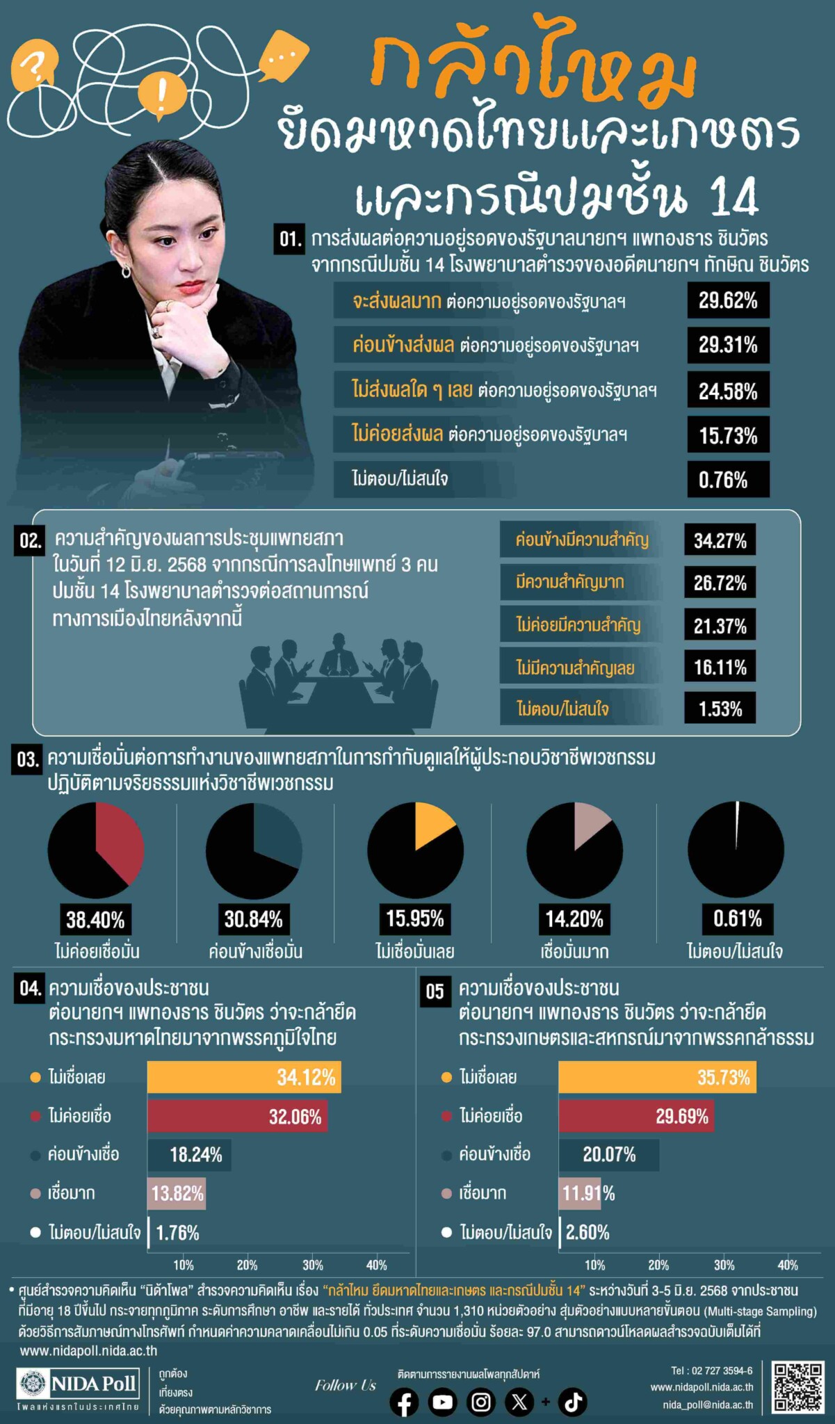 ศูนย์สำรวจความคิดเห็น “นิด้าโพล” สถาบันบัณฑิตพัฒนบริหารศาสตร์ (นิด้า) เปิดเผยผลการสำรวจ เรื่อง กล้าไหมยึดมหาดไทยและเกษตรและกรณีปมชั้น 14” ทำการสำรวจระหว่างวันที่ 3-5 มิถุนายน 2568 จากประชาชนที่มีอายุ 18 ปีขึ้นไป กระจายทุกภูมิภาค ระดับการศึกษา อาชีพ และรายได้ ทั่วประเทศ รวมจำนวนทั้งสิ้น 1,310 หน่วยตัวอย่าง เกี่ยวกับความเชื่อมั่นของประชาชนต่อกรณีปมชั้น 14 โรงพยาบาลตำรวจ ของอดีตนายกรัฐมนตรีทักษิณ ชินวัตร การสำรวจอาศัยการสุ่มตัวอย่างโดยใช้ความน่าจะเป็นจากบัญชีรายชื่อฐานข้อมูลตัวอย่างหลัก (Master Sample) ของ “นิด้าโพล” สุ่มตัวอย่างแบบหลายขั้นตอน (Multi-stage Sampling) เก็บข้อมูลด้วยวิธีการสัมภาษณ์ ทางโทรศัพท์ โดยกำหนดค่าความคลาดเคลื่อนไม่เกิน 0.05 ที่ระดับความเชื่อมั่น ร้อยละ 97.0