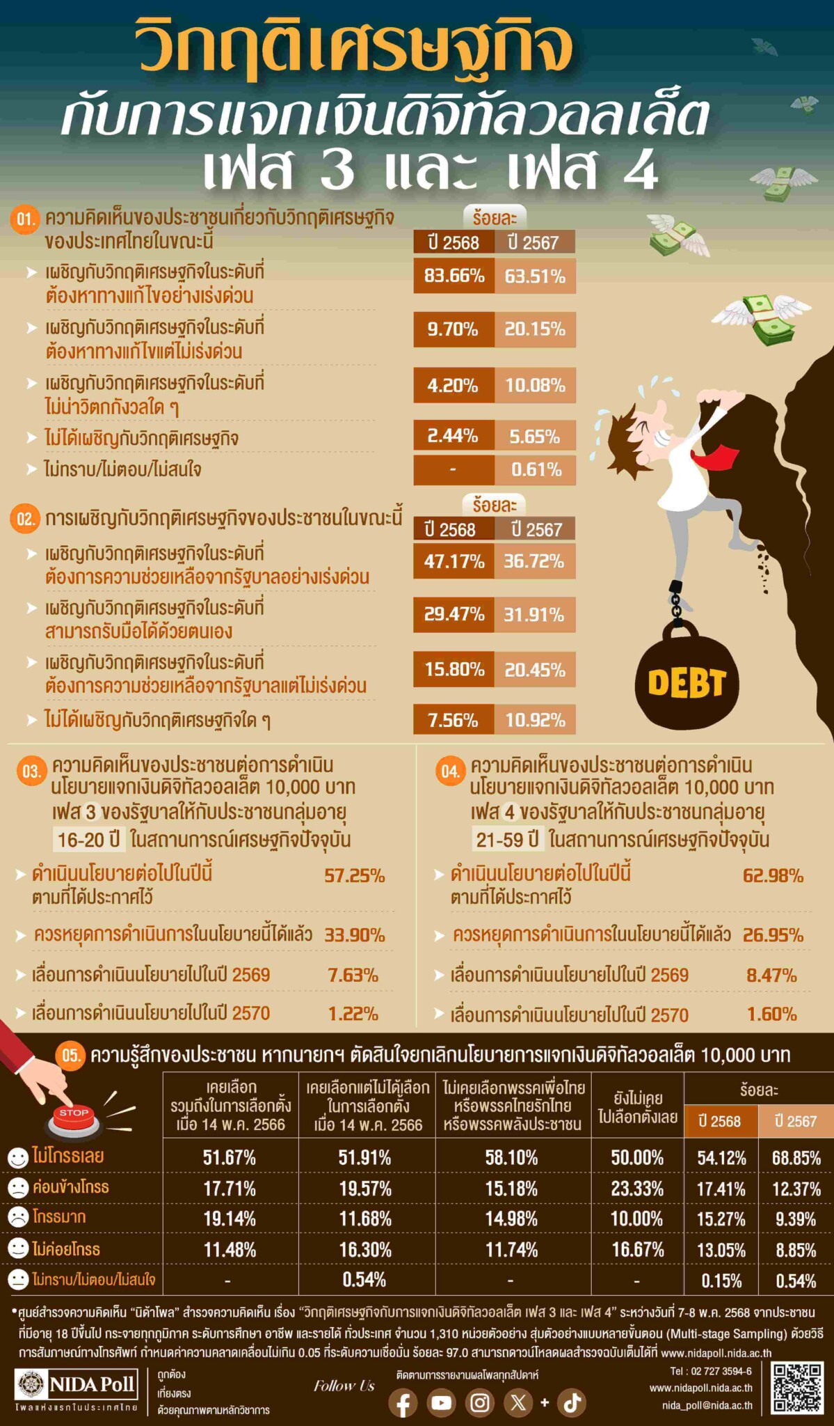 ศูนย์สำรวจความคิดเห็น “นิด้าโพล” สถาบันบัณฑิตพัฒนบริหารศาสตร์ (นิด้า) เปิดเผยผลการสำรวจเรื่อง “วิกฤติเศรษฐกิจกับการแจกเงินดิจิทัลวอลเล็ตเฟส 3 และเฟส 4” ทำการสำรวจระหว่างวันที่ 7-8 พฤษภาคม 2568 จากประชาชนที่มีอายุ 18 ปีขึ้นไป กระจายทุกภูมิภาค ระดับการศึกษา อาชีพ และรายได้ ทั่วประเทศ รวมจำนวนทั้งสิ้น 1,310 หน่วยตัวอย่าง เกี่ยวกับวิกฤติเศรษฐกิจกับการแจกเงินดิจิทัลวอลเล็ต 10,000 บาท การสำรวจอาศัยการสุ่มตัวอย่างโดยใช้ความน่าจะเป็นจากบัญชีรายชื่อฐานข้อมูลตัวอย่างหลัก (Master Sample) ของ “นิด้าโพล”สุ่มตัวอย่างแบบหลายขั้นตอน (Multi-stage Sampling) เก็บข้อมูลด้วยวิธีการสัมภาษณ์ทางโทรศัพท์ โดยกำหนดค่าความคลาดเคลื่อนไม่เกิน 0.05 ที่ระดับความเชื่อมั่น ร้อยละ 97.0
