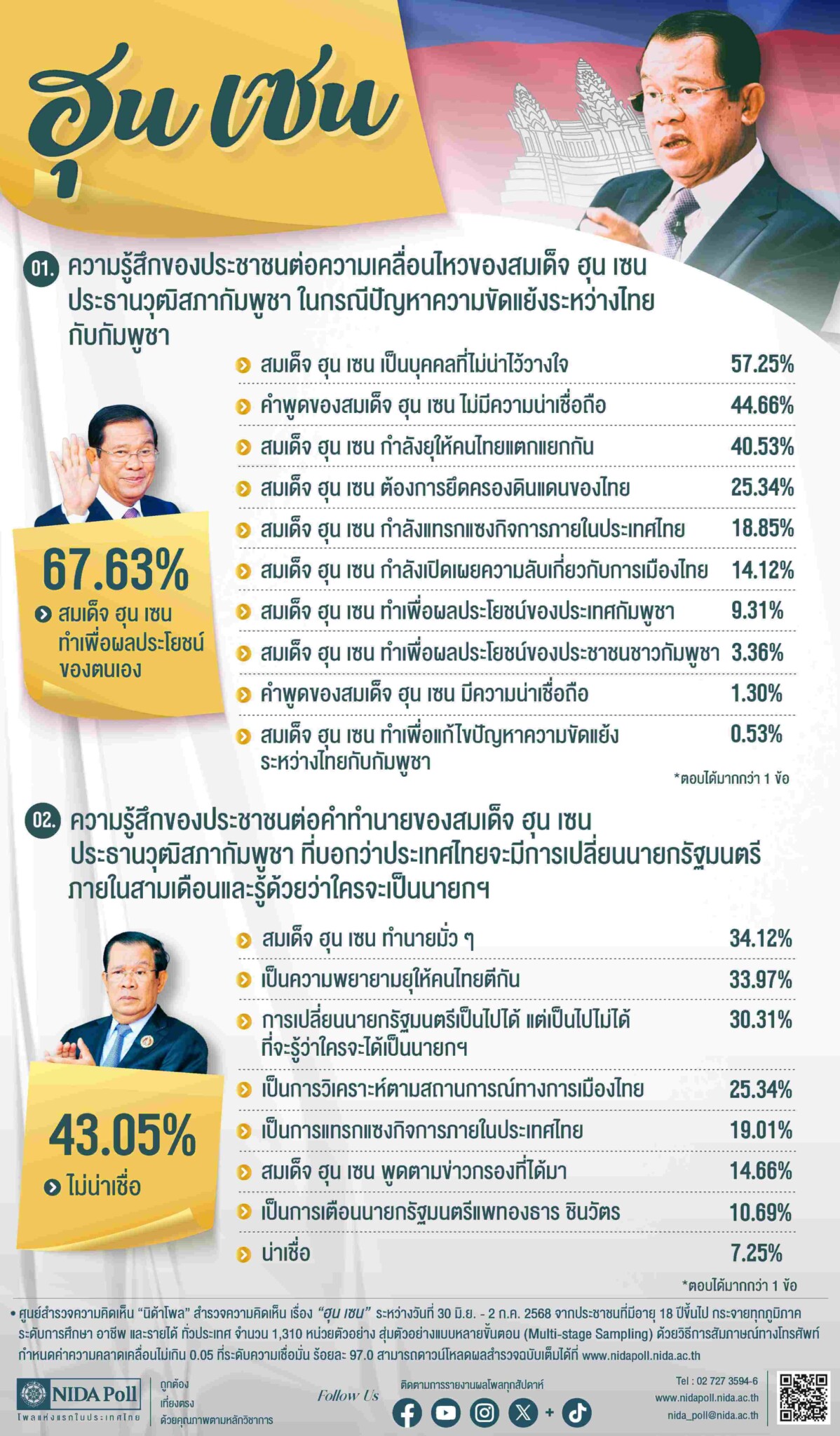 ศูนย์สำรวจความคิดเห็น “นิด้าโพล” สถาบันบัณฑิตพัฒนบริหารศาสตร์ (นิด้า) เปิดเผยผลการสำรวจ เรื่อง “ฮุนเซน” ทำการสำรวจระหว่างวันที่ 30 มิถุนายน – 2 กรกฎาคม 2568 จากประชาชนที่มีอายุ 18 ปีขึ้นไป กระจายทุกภูมิภาค ระดับการศึกษา อาชีพ และรายได้ ทั่วประเทศ รวมจำนวนทั้งสิ้น 1,310 หน่วยตัวอย่าง เกี่ยวกับความรู้สึกของประชาชนต่อความเคลื่อนไหวของสมเด็จ ฮุน เซน ในกรณีปัญหาความขัดแย้งระหว่างไทยกับกัมพูชา การสำรวจอาศัยการสุ่มตัวอย่างโดยใช้ความน่าจะเป็นจากบัญชีรายชื่อฐานข้อมูลตัวอย่างหลัก (Master Sample) ของ “นิด้าโพล” สุ่มตัวอย่างแบบหลายขั้นตอน (Multi-stage Sampling) เก็บข้อมูลด้วยวิธีการสัมภาษณ์ทางโทรศัพท์ โดยกำหนดค่าความคลาดเคลื่อนไม่เกิน 0.05 ที่ระดับความเชื่อมั่น ร้อยละ 97.0