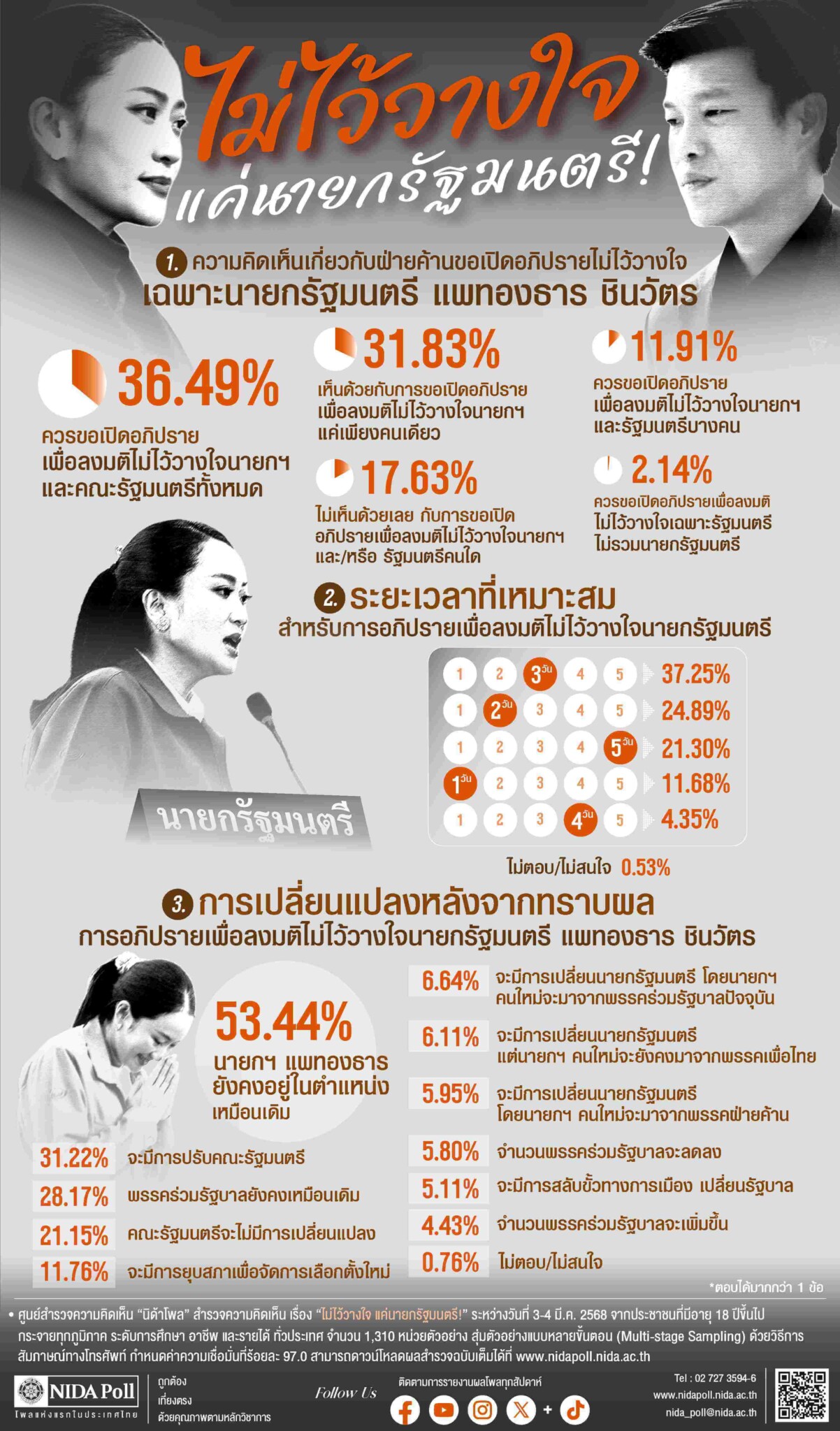 จากการสำรวจเมื่อถามประชาชนถึงความคิดเห็นเกี่ยวกับฝ่ายค้านขอเปิดอภิปรายไม่ไว้วางใจเฉพาะนายกรัฐมนตรี แพทองธาร ชินวัตร พบว่า ตัวอย่าง ร้อยละ 36.49 ระบุว่า ควรขอเปิดอภิปรายเพื่อลงมติไม่ไว้วางใจนายกฯ และคณะรัฐมนตรีทั้งหมด รองลงมา ร้อยละ 31.83 ระบุว่า เห็นด้วยกับการขอเปิดอภิปรายเพื่อลงมติไม่ไว้วางใจนายกฯ แค่เพียงคนเดียว ร้อยละ 17.63 ระบุว่า ไม่เห็นด้วยเลยกับการขอเปิดอภิปรายเพื่อลงมติไม่ไว้วางใจนายกฯ และ/หรือ รัฐมนตรีคนใด ร้อยละ 11.91 ระบุว่า ควรขอเปิดอภิปรายเพื่อลงมติไม่ไว้วางใจนายกฯและรัฐมนตรีบางคน และร้อยละ 2.14 ระบุว่า ควรขอเปิดอภิปรายเพื่อลงมติไม่ไว้วางใจเฉพาะรัฐมนตรี ไม่รวมนายกรัฐมนตรี