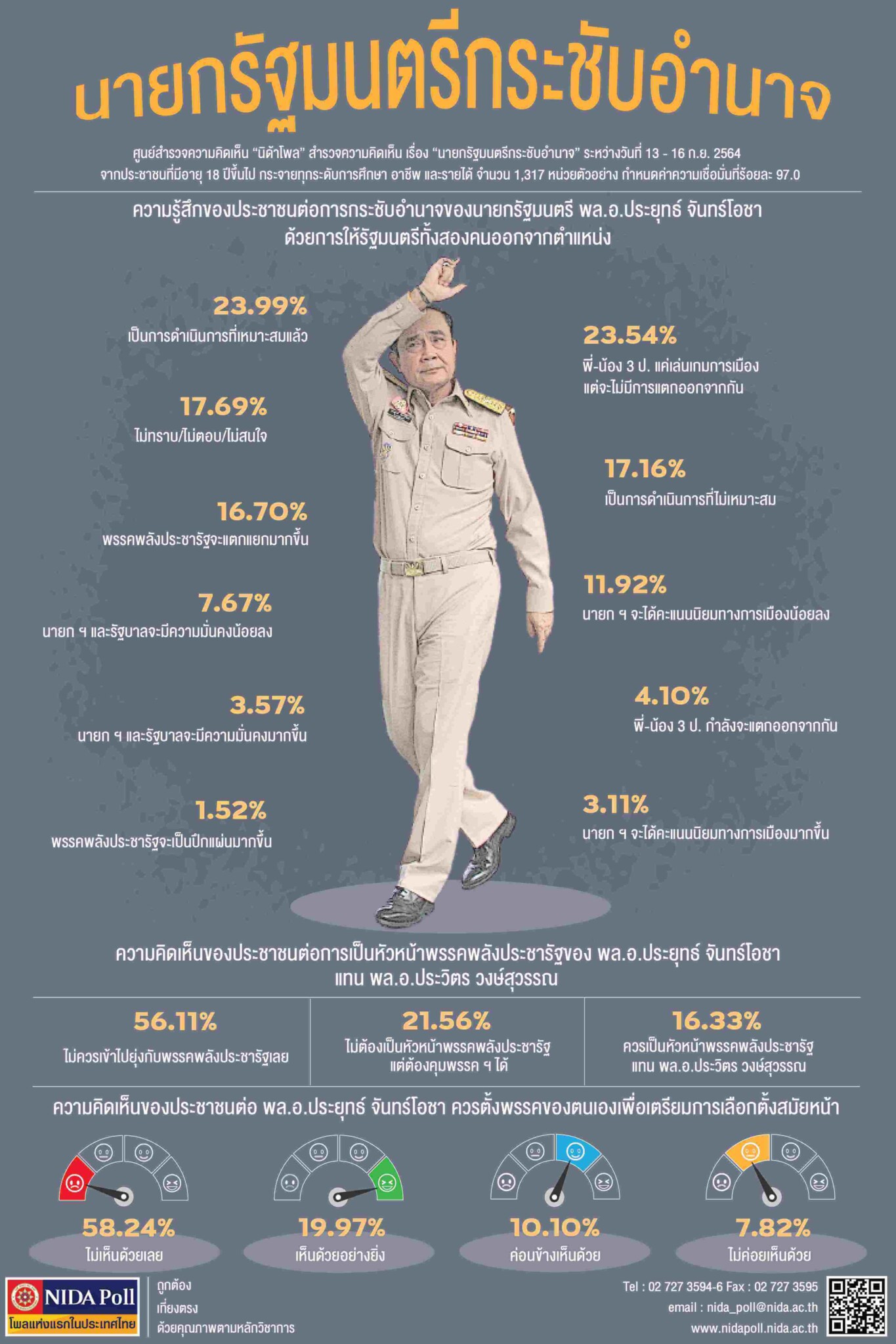 ศูนย์สำรวจความคิดเห็น “นิด้าโพล” สถาบันบัณฑิตพัฒนบริหารศาสตร์ (นิด้า) เปิดเผยผลสำรวจของประชาชน เรื่อง นายกรัฐมนตรีกระชับอำนาจทำการสำรวจระหว่างวันที่ 13 – 16 กันยายน 2564 จากประชาชนที่มีอายุ 18 ปีขึ้นไป กระจายทุกภูมิภาค ระดับการศึกษา และอาชีพทั่วประเทศ รวมทั้งสิ้น จำนวน 1,317 หน่วยตัวอย่าง เกี่ยวกับการกระชับอำนาจของนายกรัฐมนตรี พล.อ.ประยุทธ์ จันทร์โอชา การสำรวจอาศัย การสุ่มตัวอย่างโดยใช้ความน่าจะเป็นจากบัญชีรายชื่อฐานข้อมูลตัวอย่างหลัก (Master Sample) ของ “นิด้าโพล” สุ่มตัวอย่างด้วยวิธีแบบง่าย (Simple Random Sampling) เก็บข้อมูลด้วยวิธีการสัมภาษณ์ทางโทรศัพท์ โดยกำหนดค่าความเชื่อมั่นที่ร้อยละ 97.0