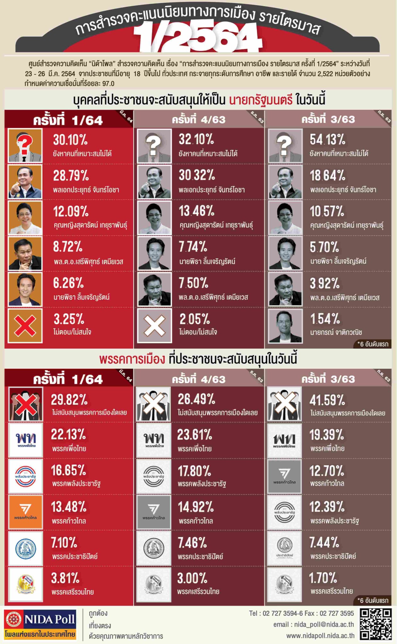 ศูนย์สำรวจความคิดเห็น “นิด้าโพล” สถาบันบัณฑิตพัฒนบริหารศาสตร์ (นิด้า) เปิดเผยผลสำรวจของประชาชน เรื่อง “การสำรวจคะแนนนิยมทางการเมืองรายไตรมาสครั้งที่ 1/2564” ทำการสำรวจระหว่างวันที่ 23 – 26 มีนาคม 2564 จากประชาชนที่มีอายุ 18 ปีขึ้นไป กระจายทุกภูมิภาค ระดับการศึกษา และอาชีพทั่วประเทศ รวมทั้งสิ้น จำนวน 2,522 หน่วยตัวอย่าง เกี่ยวกับการสำรวจคะแนนนิยมทางการเมือง การสำรวจอาศัย การสุ่มตัวอย่างโดยใช้ความน่าจะเป็นจากบัญชีรายชื่อฐานข้อมูลตัวอย่างหลัก (Master Sample) ของ “นิด้าโพล” สุ่มตัวอย่างด้วยวิธีแบบง่าย (Simple Random Sampling) เก็บข้อมูลด้วยวิธีการสัมภาษณ์ทางโทรศัพท์ โดยกำหนดค่าความเชื่อมั่นที่ร้อยละ 97.0