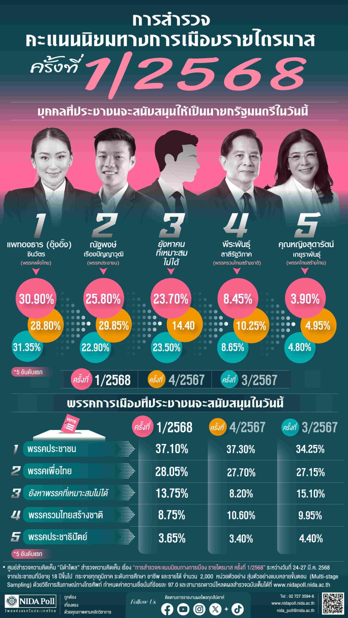 ศูนย์สำรวจความคิดเห็น “นิด้าโพล” สถาบันบัณฑิตพัฒนบริหารศาสตร์ (นิด้า) เปิดเผยผลการสำรวจเรื่อง “การสำรวจคะแนนนิยมทางการเมืองรายไตรมาสครั้งที่ 1/2568” ทำการสำรวจระหว่างวันที่ 24-27 มีนาคม 2568 จากประชาชนที่มีอายุ 18 ปีขึ้นไป กระจายทุกภูมิภาค ระดับการศึกษา อาชีพ และรายได้ ทั่วประเทศ รวมจำนวนทั้งสิ้น 2,000 หน่วยตัวอย่าง เกี่ยวกับคะแนนนิยมทางการเมือง การสำรวจอาศัยการสุ่มตัวอย่างโดยใช้ความน่าจะเป็นจากบัญชีรายชื่อฐานข้อมูลตัวอย่างหลัก (Master Sample) ของ “นิด้าโพล” สุ่มตัวอย่างแบบหลายขั้นตอน (Multi-stage Sampling) เก็บข้อมูลด้วยวิธีการสัมภาษณ์ทางโทรศัพท์ โดยกำหนดค่าความเชื่อมั่น ร้อยละ 97.0