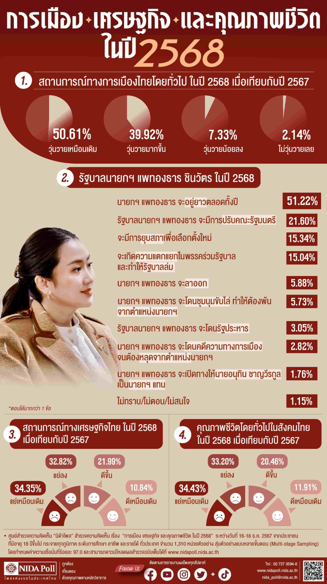 ด้านความคิดเห็นของประชาชนเกี่ยวกับรัฐบาลนายกรัฐมนตรีแพทองธาร ชินวัตร ในปี 2568 พบว่า ตัวอย่าง ร้อยละ 51.22 ระบุว่า นายกรัฐมนตรีแพทองธาร ชินวัตร จะอยู่ยาวตลอดทั้งปี รองลงมา ร้อยละ 21.60 ระบุว่า รัฐบาลนายกรัฐมนตรีแพทองธาร ชินวัตร จะมีการปรับคณะรัฐมนตรี ร้อยละ 15.34 ระบุว่า จะมีการยุบสภาเพื่อเลือกตั้งใหม่ ร้อยละ 15.04 ระบุว่า จะเกิดความแตกแยกในพรรคร่วมรัฐบาล และทำให้รัฐบาลล่ม ร้อยละ 5.88 ระบุว่า นายกรัฐมนตรีแพทองธาร ชินวัตร จะลาออก ร้อยละ 5.73 ระบุว่า นายกรัฐมนตรีแพทองธาร ชินวัตร จะโดนชุมนุมขับไล่ ทำให้ต้องพ้นจากตำแหน่งนายกรัฐมนตรี ร้อยละ 3.05 ระบุว่า รัฐบาลนายกรัฐมนตรีแพทองธาร ชินวัตร จะโดนรัฐประหาร ร้อยละ 2.82 ระบุว่า นายกรัฐมนตรีแพทองธาร ชินวัตร จะโดนคดีความทางการเมืองจนต้องหลุดจากตำแหน่งนายกรัฐมนตรี ร้อยละ 1.76 ระบุว่า นายกรัฐมนตรีแพทองธาร ชินวัตร จะเปิดทางให้นายอนุทินชาญวีรกูล เป็นนายกรัฐมนตรีแทน และร้อยละ 1.15 ระบุว่า ไม่ทราบ/ไม่ตอบ/ไม่สนใจ