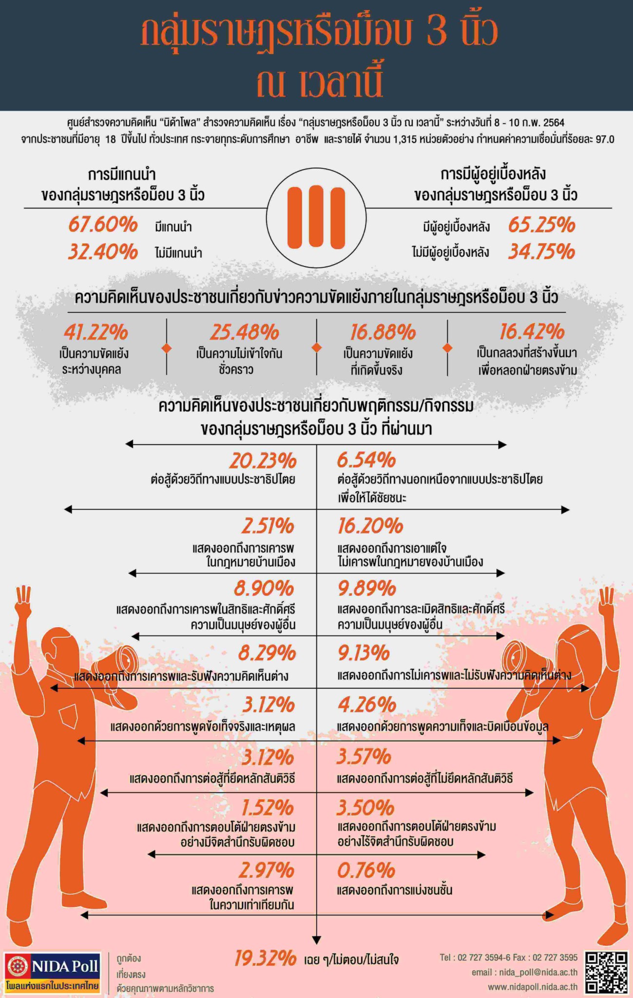 ศูนย์สำรวจความคิดเห็น “นิด้าโพล” สถาบันบัณฑิตพัฒนบริหารศาสตร์ (นิด้า) เปิดเผยผลสำรวจของประชาชน เรื่อง กลุ่มราษฎร หรือม็อบสามนิ้วเวลานี้ทำการสำรวจระหว่างวันที่ 8 – 10 กุมภาพันธ์ 2564 จากประชาชนที่มีอายุ 18 ปีขึ้นไป กระจายทุกภูมิภาค ระดับการศึกษา และอาชีพทั่วประเทศ รวมทั้งสิ้น จำนวน 1,315 หน่วยตัวอย่าง เกี่ยวกับกลุ่มราษฎรหรือม็อบสามนิ้ว ณ เวลานี้ การสำรวจอาศัยการสุ่มตัวอย่างโดยใช้ความน่าจะเป็นจากบัญชีรายชื่อฐานข้อมูลตัวอย่างหลัก (Master Sample) ของ “นิด้าโพล” สุ่มตัวอย่างด้วยวิธีแบบง่าย (Simple Random Sampling) เก็บข้อมูลด้วยวิธีการสัมภาษณ์ทางโทรศัพท์โดยกำหนดค่าความเชื่อมั่นที่ร้อยละ 97.0