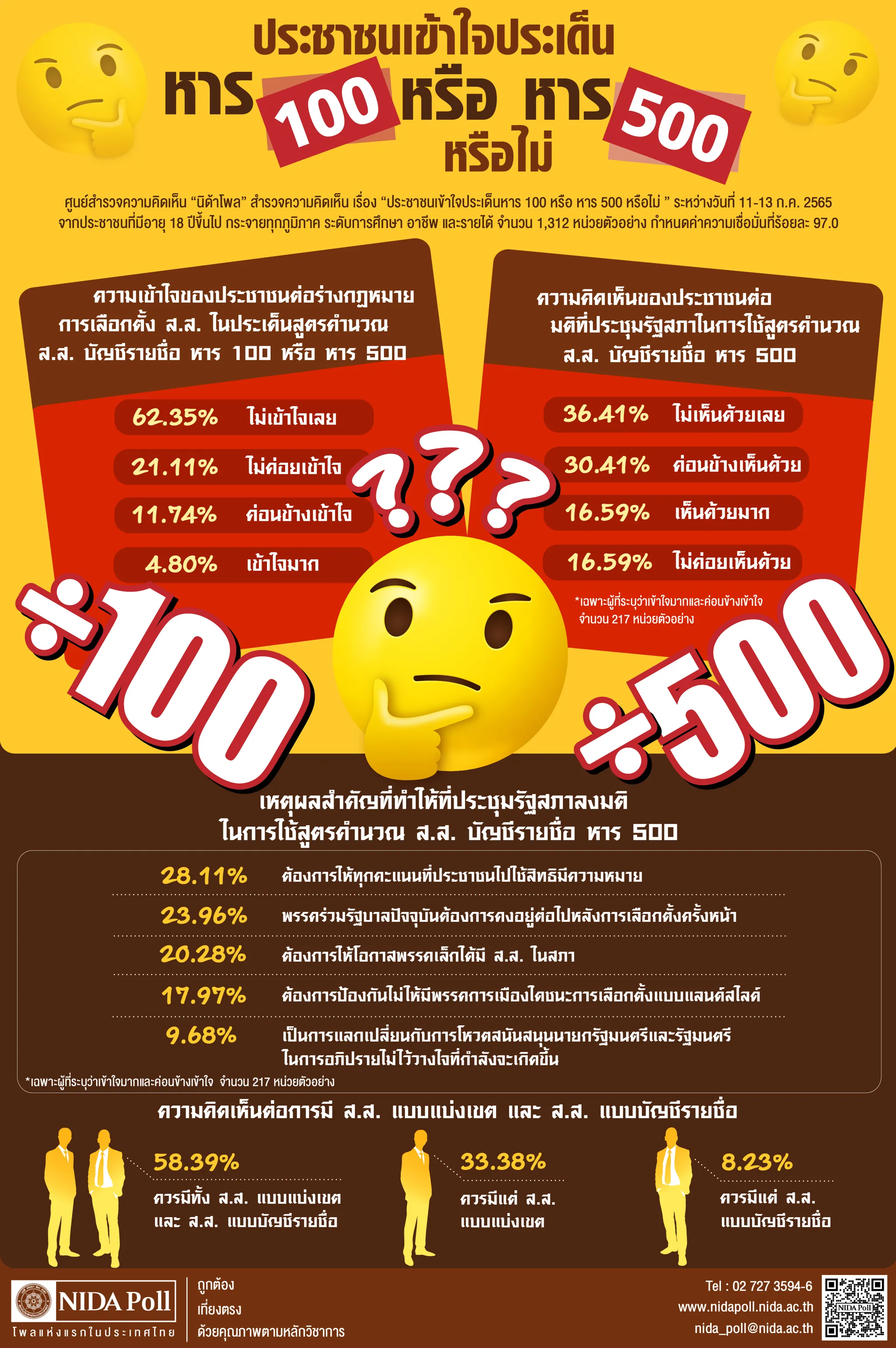 ศูนย์สำรวจความคิดเห็น นิด้าโพล สถาบันบัณฑิตพัฒนบริหารศาสตร์ (นิด้า) เปิดเผยผลสำรวจของประชาชน เรื่อง ประชาชนเข้าใจประเด็นหาร 100 หรือหาร 500 หรือไม่ ทำการสำรวจระหว่างวันที่ 11–13 กรกฎาคม 2565 จากประชาชนที่มีอายุ 18 ปีขึ้นไป กระจายทุกภูมิภาค ระดับการศึกษา อาชีพ และรายได้ทั่วประเทศ รวมทั้งสิ้น 1,312 หน่วยตัวอย่าง เกี่ยวกับความเข้าใจต่อร่างกฎหมายการเลือกตั้ง ส.ส. ในประเด็นสูตรคำนวณ ส.ส. บัญชีรายชื่อ หาร 100 หรือ หาร 500 การสำรวจอาศัยการสุ่มตัวอย่างโดยใช้ความน่าจะเป็นจากบัญชีรายชื่อฐานข้อมูลตัวอย่างหลัก (Master Sample) ของ นิด้าโพล สุ่มตัวอย่างด้วยวิธีแบบง่าย (Simple Random Sampling) เก็บข้อมูลด้วยวิธีการสัมภาษณ์ทางโทรศัพท์ โดยกำหนดค่าความเชื่อมั่น ร้อยละ 97.0