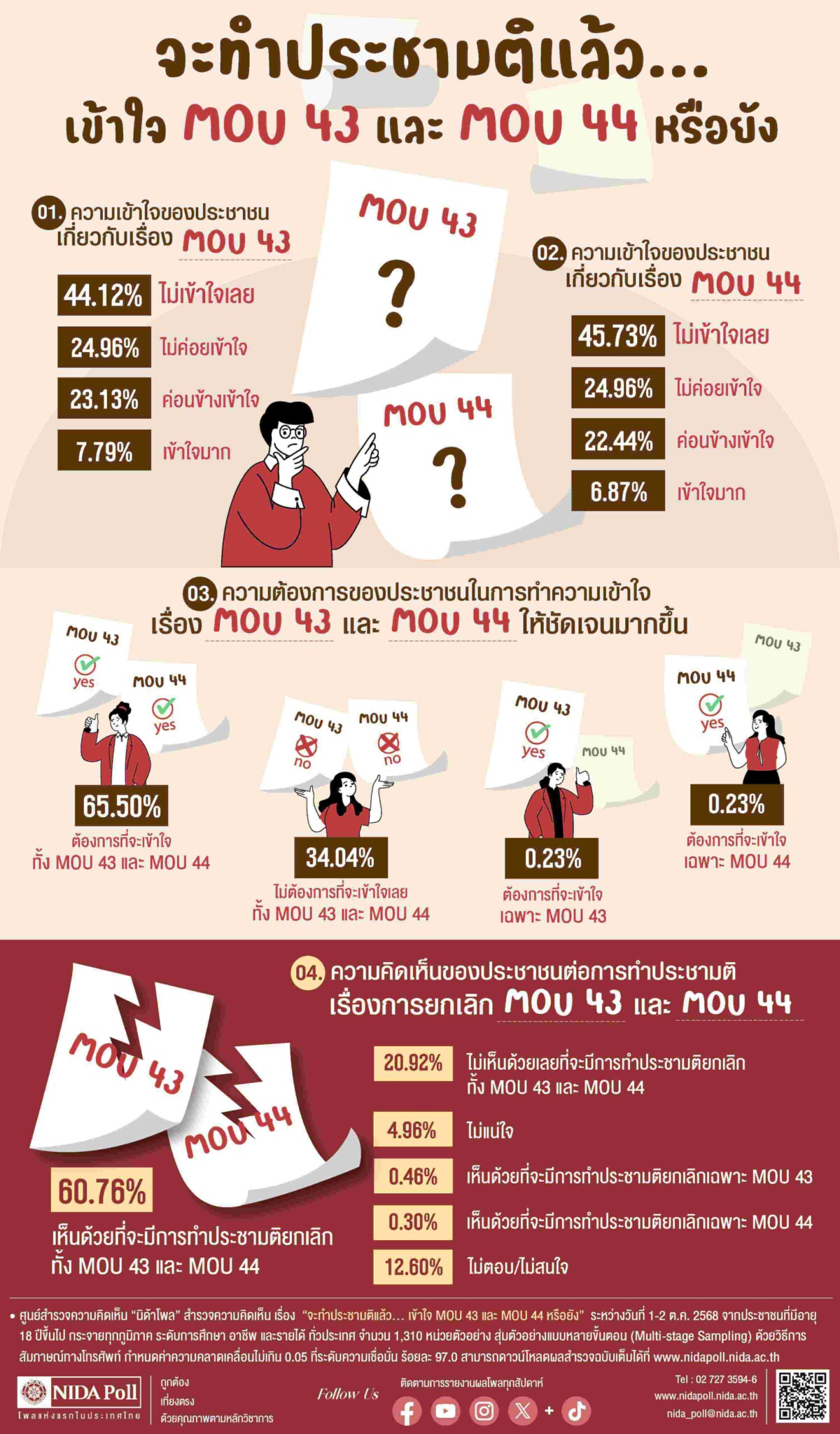 ศูนย์สำรวจความคิดเห็น “นิด้าโพล” สถาบันบัณฑิตพัฒนบริหารศาสตร์ (นิด้า) เปิดเผยผลการสำรวจ เรื่อง “จะทำประชามติแล้ว…เข้าใจ MOU 43 และ MOU 44 หรือยัง” ทำการสำรวจระหว่างวันที่ 1-2 ตุลาคม 2568 จากประชาชนที่มีอายุ 18 ปีขึ้นไป กระจายทุกภูมิภาค ระดับการศึกษา อาชีพ และรายได้ ทั่วประเทศ รวมจำนวนทั้งสิ้น 1,310 หน่วยตัวอย่าง เกี่ยวกับความเข้าใจของประชาชนต่อ MOU 43 และ MOU 44 ก่อนการทำประชามติ การสำรวจอาศัยการสุ่มตัวอย่างโดยใช้ความน่าจะเป็นจากบัญชีรายชื่อฐานข้อมูลตัวอย่างหลัก (Master Sample) ของ “นิด้าโพล” สุ่มตัวอย่างแบบหลายขั้นตอน (Multi-stage Sampling) เก็บข้อมูลด้วยวิธีการสัมภาษณ์ทางโทรศัพท์ โดยกำหนดค่าความคลาดเคลื่อนไม่เกิน 0.05 ที่ระดับความเชื่อมั่น ร้อยละ 97.0