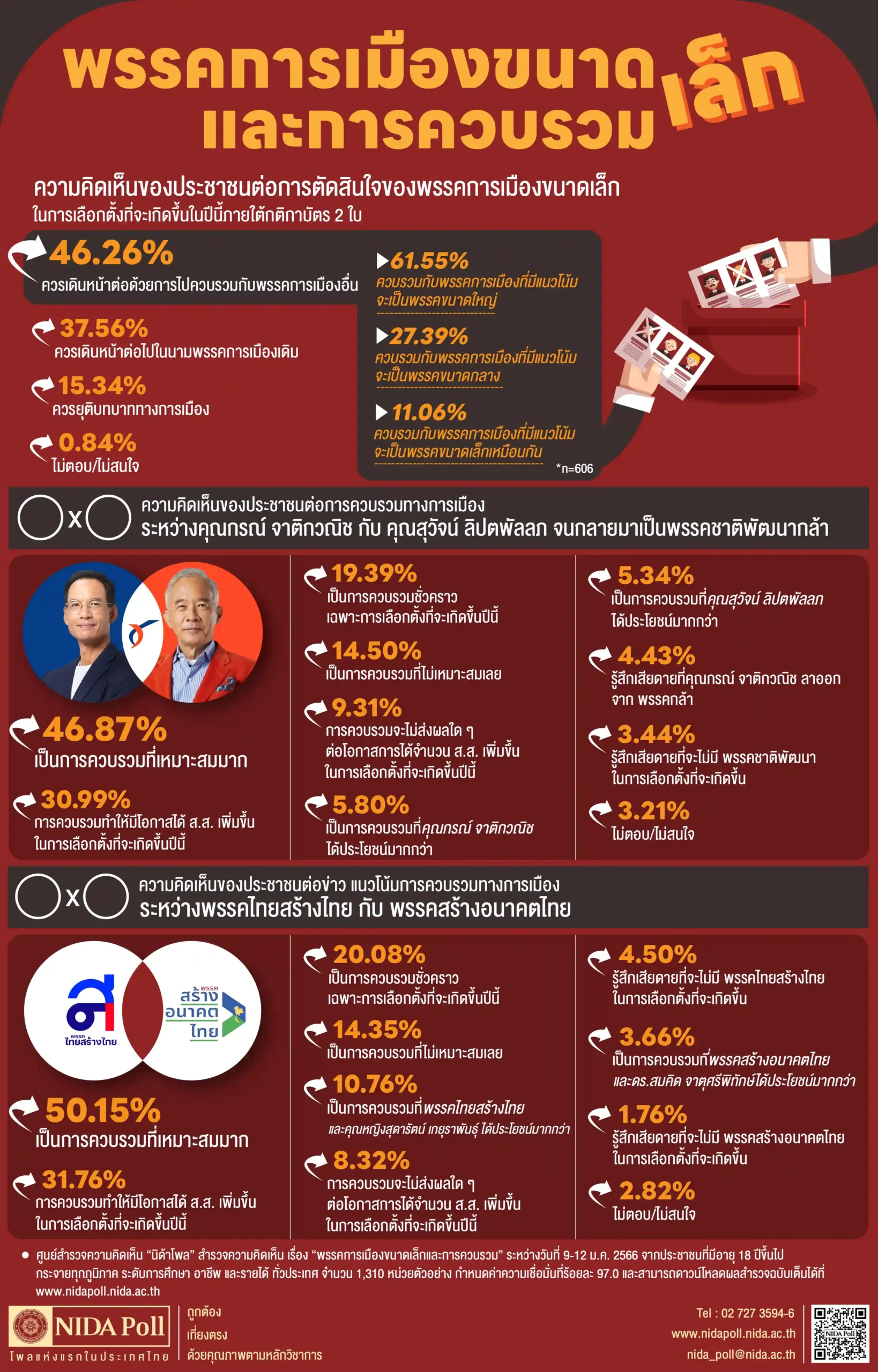 จากการสำรวจเมื่อถามถึงความคิดเห็นของประชาชนต่อการตัดสินใจของพรรคการเมืองขนาดเล็ก ในการเลือกตั้งที่จะเกิดขึ้นในปีนี้ภายใต้กติกาบัตร 2 ใบ พบว่า ตัวอย่าง ร้อยละ 46.26 ระบุว่า ควรเดินหน้าต่อด้วยการไปควบรวมกับพรรคการเมืองอื่น รองลงมา ร้อยละ 37.56 ระบุว่า ควรเดินหน้าต่อไปในนามพรรคการเมืองเดิม ร้อยละ 15.34 ระบุว่า ควรยุติบทบาททางการเมือง และร้อยละ 0.84 ระบุว่า ไม่ตอบ/ไม่สนใจ เมื่อถามผู้ที่ระบุว่า ควรเดินหน้าต่อด้วยการไปควบรวมกับพรรคการเมืองอื่น (จำนวน 606 หน่วยตัวอย่าง) เกี่ยวขนาดของพรรคการเมือง ที่ควรไปควบรวม พบว่า ตัวอย่าง ร้อยละ 61.55 ระบุว่า ควรไปควบรวมกับพรรคการเมืองที่มีแนวโน้มจะเป็นพรรคขนาดใหญ่ รองลงมา ร้อยละ 27.39 ระบุว่า ควรไปควบรวมกับพรรคการเมืองที่มีแนวโน้มจะเป็นพรรคขนาดกลาง และร้อยละ 11.06 ระบุว่า ควรไปควบรวมกับพรรคการเมืองที่มีขนาดเล็กเหมือนกัน