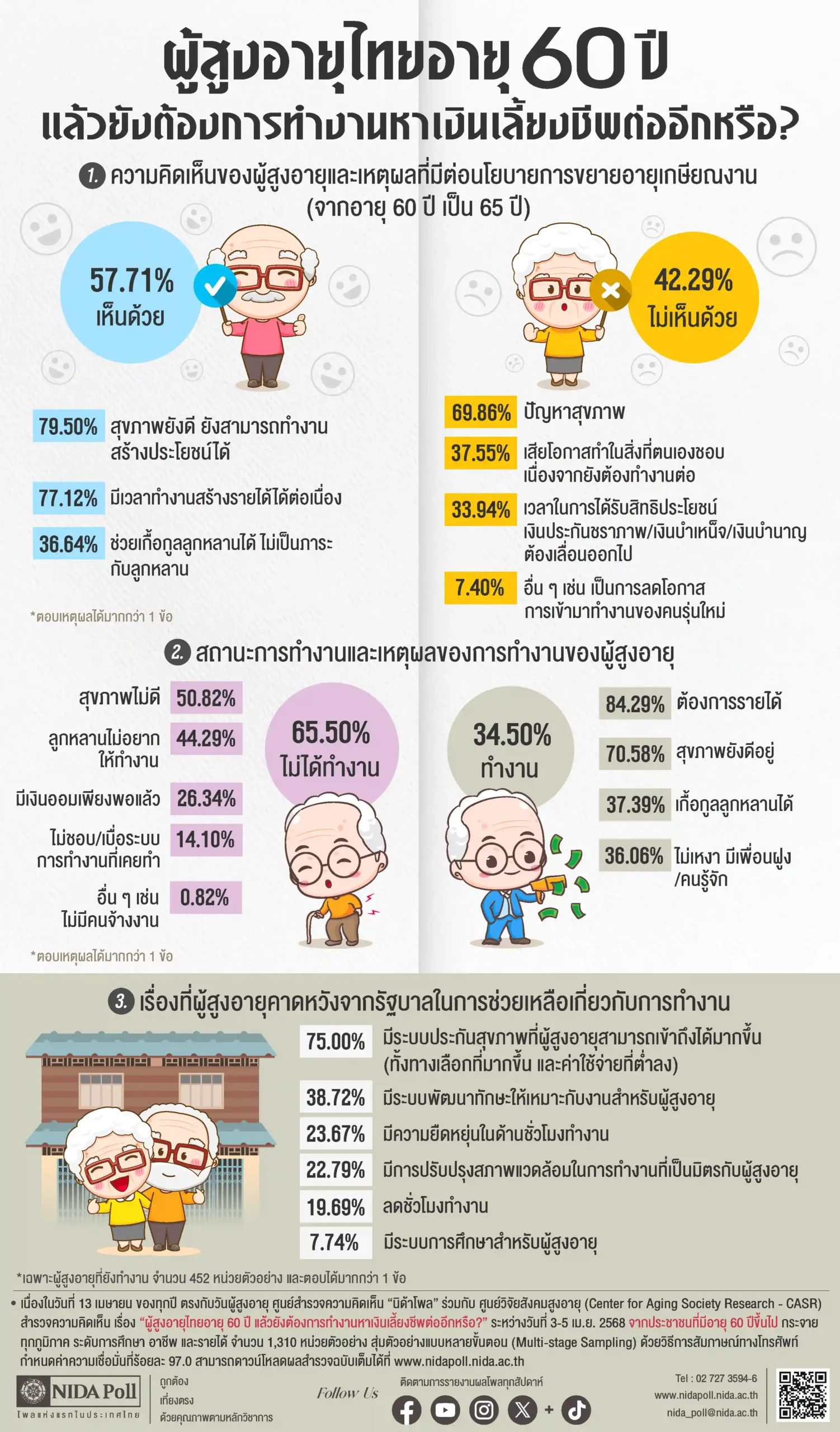 เนื่องในวันที่ 13 เมษายนของทุกปีตรงกับวันผู้สูงอายุศูนย์สำรวจความคิดเห็น “นิด้าโพล” ร่วมกับศูนย์วิจัยสังคมสูงอายุ (Center for Aging Society Research – CASR) สถาบันบัณฑิตพัฒนบริหารศาสตร์ (นิด้า) เปิดเผยผลการสำรวจเรื่อง “ผู้สูงอายุไทยอายุ 60 ปีแล้วยังต้องการทำงานหาเงินเลี้ยงชีพต่ออีกหรือ ?” ทำการสำรวจระหว่างวันที่ 3-5 เมษายน 2568 จากประชาชนที่มีอายุ 60 ปีขึ้นไป กระจายทุกภูมิภาค ระดับการศึกษา อาชีพ และรายได้ ทั่วประเทศ รวมจำนวนทั้งสิ้น 1,310 หน่วยตัวอย่าง เกี่ยวกับความคิดเห็นของผู้สูงอายุที่มีต่อการทำงานหลังวัยเกษียณ การสำรวจอาศัยการสุ่มตัวอย่างโดยใช้ความน่าจะเป็นจากบัญชีรายชื่อฐานข้อมูลตัวอย่างหลัก (Master Sample) ของ “นิด้าโพล” สุ่มตัวอย่างแบบหลายขั้นตอน (Multi-stage Sampling) เก็บข้อมูลด้วยวิธีการสัมภาษณ์ทางโทรศัพท์ โดยกำหนดค่าความเชื่อมั่น ร้อยละ 97.0