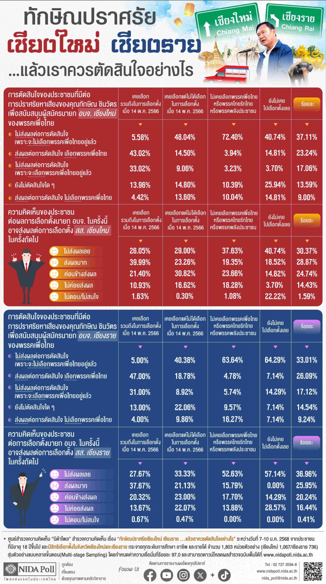 ศูนย์สำรวจความคิดเห็น “นิด้าโพล” สถาบันบัณฑิตพัฒนบริหารศาสตร์ (นิด้า) เปิดเผยผลการสำรวจของประชาชน เรื่อง “ทักษิณปราศรัยเชียงใหม่เชียงราย …แล้วเราควรตัดสินใจอย่างไร” ทำการสำรวจระหว่างวันที่ 7-10 มกราคม 2568 จากประชาชนที่มีอายุ 18 ปีขึ้นไป และมีสิทธิเลือกตั้งในจังหวัดเชียงใหม่และจังหวัดเชียงราย กระจายทุกระดับการศึกษา อาชีพ และรายได้ รวมจำนวนทั้งสิ้น 1,803 หน่วยตัวอย่าง เกี่ยวกับการตัดสินใจเพื่อสนับสนุนผู้สมัครนายก อบจ. เชียงใหม่และนายก อบจ. เชียงรายของพรรคเพื่อไทย การสำรวจอาศัยการสุ่มตัวอย่างโดยใช้ความน่าจะเป็นจากบัญชีรายชื่อฐานข้อมูลตัวอย่างหลัก (Master Sample) ของ “นิด้าโพล” สุ่มตัวอย่างแบบหลายขั้นตอน (Multi-stage Sampling) เก็บข้อมูลด้วยวิธีการสัมภาษณ์ทางโทรศัพท์ โดยกำหนดค่าความเชื่อมั่น ร้อยละ 97.0
