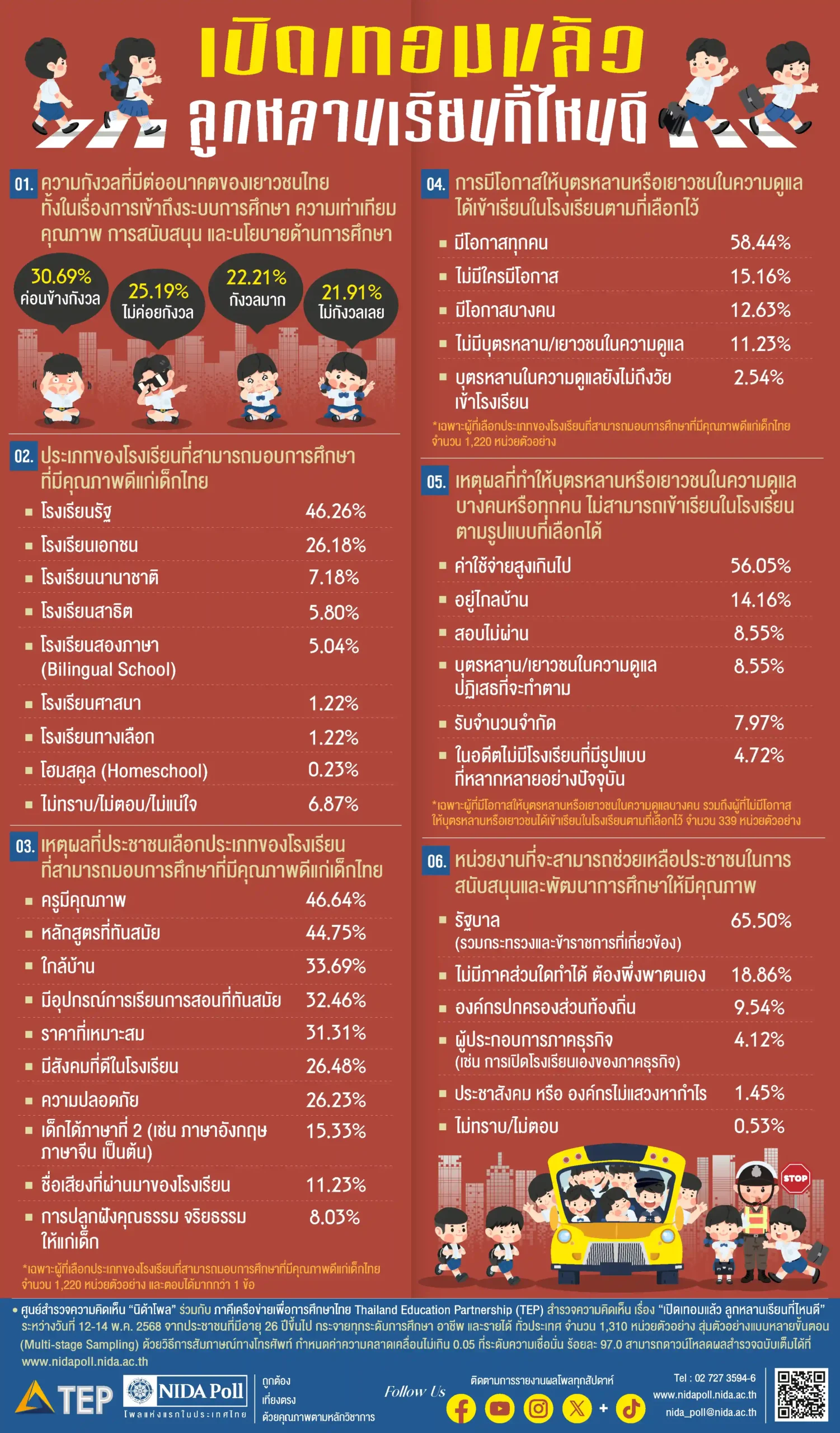 ศูนย์สำรวจความคิดเห็น “นิด้าโพล” สถาบันบัณฑิตพัฒนบริหารศาสตร์ (นิด้า) ร่วมกับ ภาคีเครือข่ายเพื่อการศึกษาไทย Thailand Education Partnership (TEP) เปิดเผยผลการสำรวจเรื่อง “เปิดเทอมแล้วลูกหลานเรียนที่ไหนดี” ทำการสำรวจระหว่างวันที่ 12-14 พฤษภาคม 2568 จากประชาชนที่มีอายุ 26 ปีขึ้นไป กระจายทุกภูมิภาค ระดับการศึกษา อาชีพ และรายได้ ทั่วประเทศ รวมจำนวนทั้งสิ้น 1,310 หน่วยตัวอย่าง เกี่ยวกับความกังวลที่มีต่ออนาคตของเยาวชนไทยในด้านการศึกษาและการเข้าถึงการศึกษาที่มีคุณภาพ การสำรวจอาศัยการสุ่มตัวอย่างโดยใช้ความน่าจะเป็นจากบัญชีรายชื่อฐานข้อมูลตัวอย่างหลัก (Master Sample) ของ “นิด้าโพล” สุ่มตัวอย่างแบบหลายขั้นตอน (Multi-stage Sampling) เก็บข้อมูลด้วยวิธีการสัมภาษณ์ทางโทรศัพท์ โดยกำหนดค่าความคลาดเคลื่อนไม่เกิน 0.05 ที่ระดับความเชื่อมั่น ร้อยละ 97.0