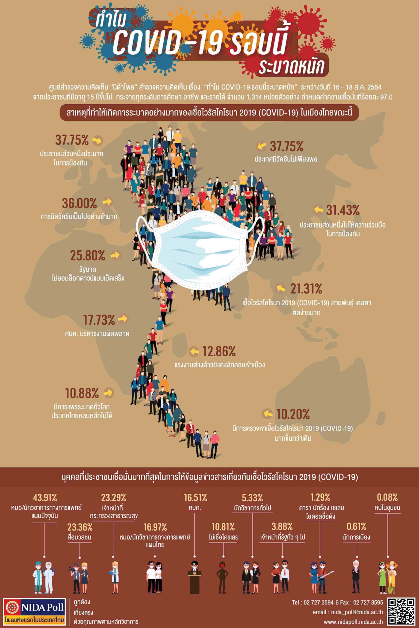 จากการสำรวจเมื่อถามประชาชนถึงสาเหตุที่ทำให้เกิดการระบาดอย่างมากของเชื้อไวรัสโคโรนา 2019 (COVID-19) ในเมืองไทยขณะนี้ พบว่า ส่วนใหญ่ ร้อยละ 37.75 ระบุว่า ประชาชนส่วนหนึ่งประมาทในการป้องกัน และประเทศมีวัคซีนไม่เพียงพอ ในสัดส่วนที่เท่ากัน รองลงมา ร้อยละ 36.00 ระบุว่า การฉีดวัคซีนเป็นไปอย่างช้ามาก ร้อยละ 31.43 ระบุว่า ประชาชนส่วนหนึ่งไม่ให้ความร่วมมือในการป้องกัน ร้อยละ 25.80 ระบุว่า รัฐบาลไม่ยอมล็อกดาวน์แบบเบ็ดเสร็จ ร้อยละ 21.31 ระบุว่า เชื้อไวรัสโคโรนา 2019 (COVID-19) สายพันธุ์เดลตา ติดง่ายมาก ร้อยละ 17.73 ระบุว่า ศบค. (ศูนย์บริหารสถานการณ์การแพร่ระบาดของโรคติดเชื้อไวรัสโคโรนา 2019) บริหารงานผิดพลาด ร้อยละ 12.86 ระบุว่า แรงงานต่างด้าวยังคงลักลอบเข้าเมือง ร้อยละ 10.88 ระบุว่า มีการแพร่ระบาดทั่วโลก ประเทศไทยหลบหลีกไม่ได้ ร้อยละ 10.20 ระบุว่า มีการตรวจหาเชื้อไวรัสโคโรนา 2019 (COVID-19) มากขึ้นกว่าเดิม ร้อยละ 0.99 ระบุอื่น ๆ ได้แก่ วัคซีนไม่มีประสิทธิภาพ รัฐบาลไม่มีมาตรการในการป้องกันและรักษาอย่างจริงจัง การอนุญาตของภาครัฐให้นักท่องเที่ยวเข้ามาในประเทศ และการจัดสรรงบประมาณในด้านสาธารณสุข ไม่ทั่วถึง และร้อยละ 1.22 ระบุว่า ไม่ทราบ/ไม่ตอบ/ไม่สนใจ